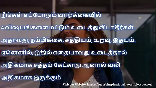 3.நீங்கள் எப்போதும் வாழ்க்கையில் 4 விஷயங்களை மட்டும் உடைத்துவிடாதீர்கள். அதாவது, நம்பிக்கை, சத்தியம், உறவு, இதயம். ஏனெனில், இதில் எதையாவது உடைத்தால் அதிகமாக சத்தம் கேட்காது ஆனால் வலி அதிகமாக இருக்கும்